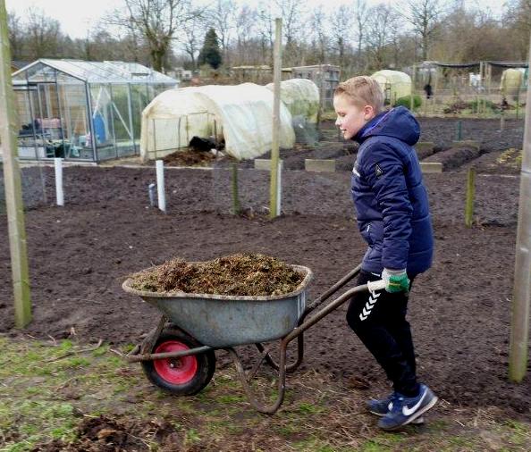 8. Mijn kleinkind, die we te logeren hadden, wilde graag wat uitwaaien buiten met die storm. Dus na een stukje fietsen zijn we de tuin ingegaan en kon hij met de kruiwagen de houtversnippering tussen mijn leibomenfruit rijden en kiepen.