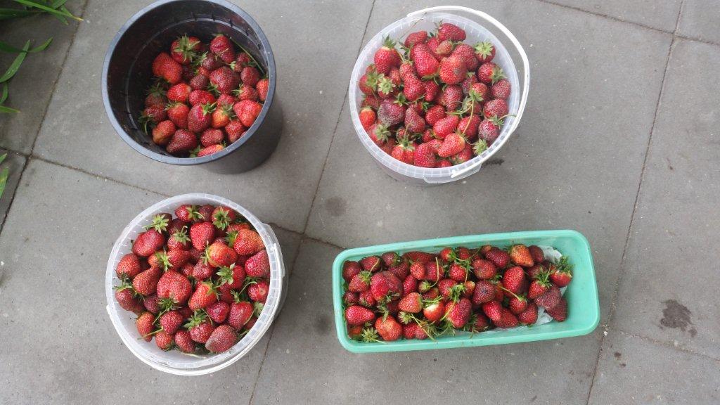 9. Lange tijd besteed aan het oogsten van mijn aardbeien. 5,5 kg opbrengst. Tussen mijn uien de grond wat open gemaakt. De uien hebben te nat gestaan. Vanwege die enorm regenbuien vorige week. De uien groeien bovenop de grond dus kwetsbaar. Veel colloradokevers, althans de larven van de kever. Elke dag vernietigen dat is volgens mij het beste.
