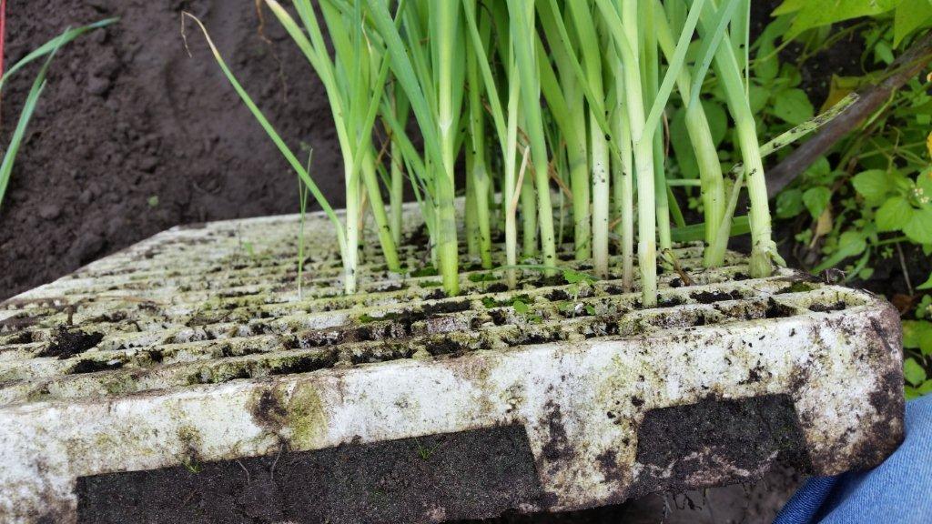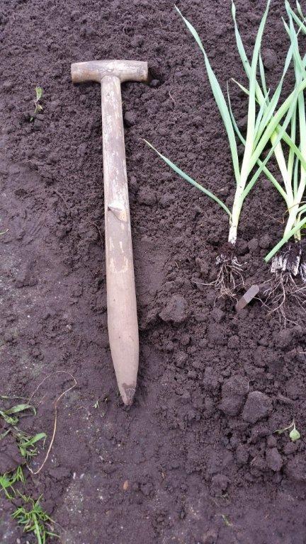 30. 125 preiplantjes gepland. De planten moeten potlooddik zijn. Ik maak gaten met een oude steel van een schop. Beetje gier in de gaten en de planten erin. Voor de eerste maal snijbonen geoogst.